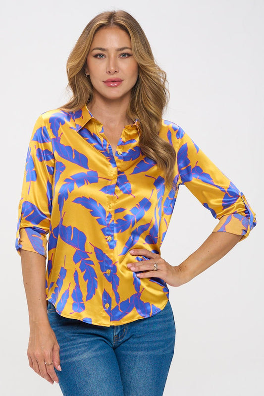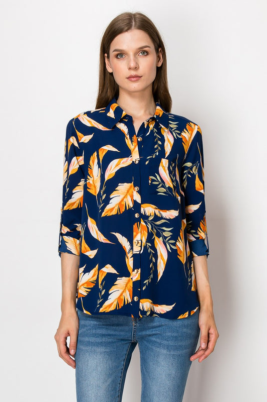 Taupe Feather Pattern Button Down Top
