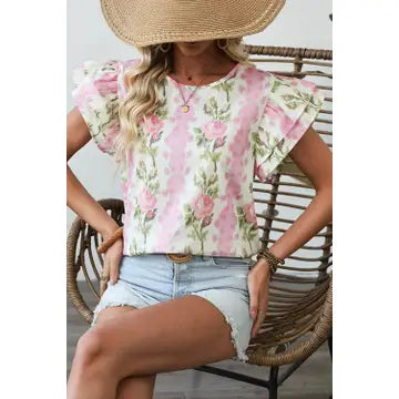 This short sleeve blouse features a soft floral print and ruffled sleeves for a light, feminine look. Made from breathable fabric with a relaxed fit, it’s easy to wear on its own or layered.