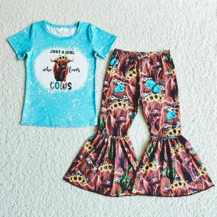 Made for the little farm girl at heart, this adorable set is all about cow-loving cuteness! The top features a sweet cow graphic with the phrase "Just a Girl Who Loves Cows", while the cow-print flare pants add the perfect touch of playful sass and country charm.