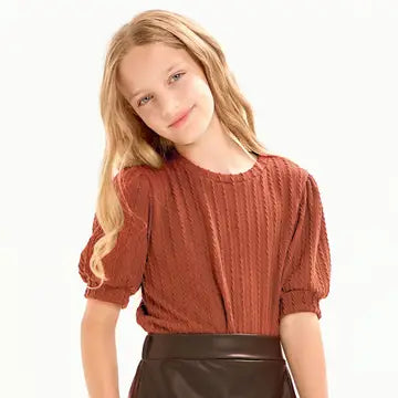 This Girls Short Sleeve Puff Knit Top combines charming style with comfortable wear. Its puff sleeves add a playful, trendy touch, while the soft knit fabric ensures all-day comfort. Perfect for casual outings or special occasions, this top effortlessly enhances any young girl's wardrobe with a sweet and fashionable look.