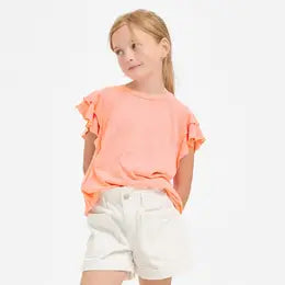 Brighten her wardrobe with this Girls Tiered Flutter Sleeve Knit Top in vibrant coral neon. The soft knit fabric ensures comfort, while the tiered design and flutter sleeves add playful movement and style. Perfect for everyday wear or special occasions, this top combines fun and fashion effortlessly.