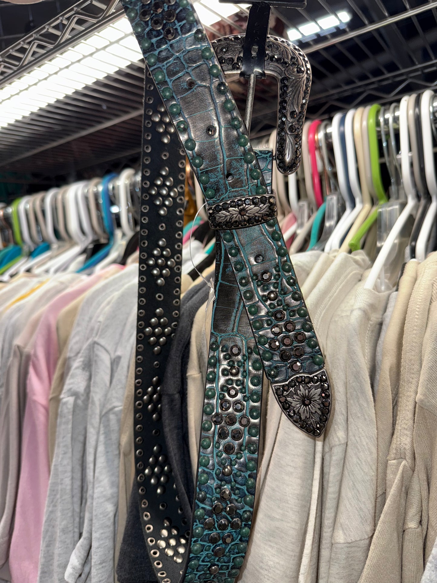 Add a touch of elegant and edgy style to your outfit with our Rhinestone and Turquoise Studded Leather Belt! This eye-catching belt is adorned with sparkling rhinestones and bold turquoise accents, adding a pop of color and shine to any ensemble. Elevate your look and make a statement with this unique and trendy accessory.