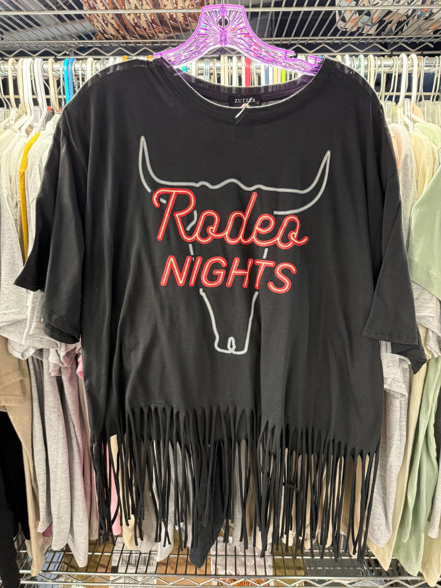 Indulge in the luxurious charm of our Short Sleeve Fringe Rodeo Nights top. Featuring delicate fringe details and a trendy short sleeve design, this piece is sure to elevate any wardrobe. Perfect for a night out on the town, this top exudes sophistication and exclusivity.