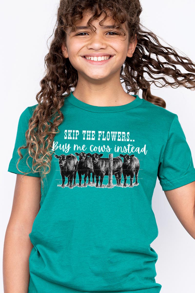 Inspire your little one's love for animals with our "Skip the Flowers Buy Me Cows" kids tee! With this clever slogan, they'll learn to value experiences over material possessions. Made with soft, durable fabric, this tee is perfect for playtime and adventures. Skip the flowers and choose cows for a meaningful and fun outfit choice!