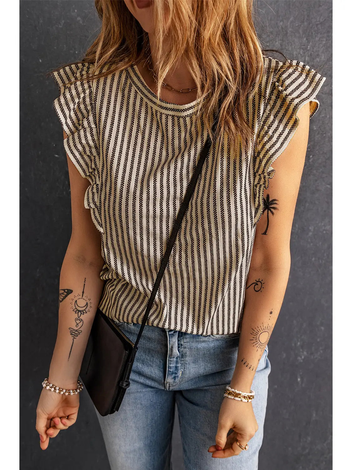 Elevate your wardrobe with the Striped Ruffle Sleeve Top, designed to blend classic patterns with a playful twist. The flattering ruffle sleeves add a feminine touch, while the timeless stripes ensure versatile styling for any occasion. Perfect for dressing up or down, this top brings effortless charm and comfort to your everyday look.