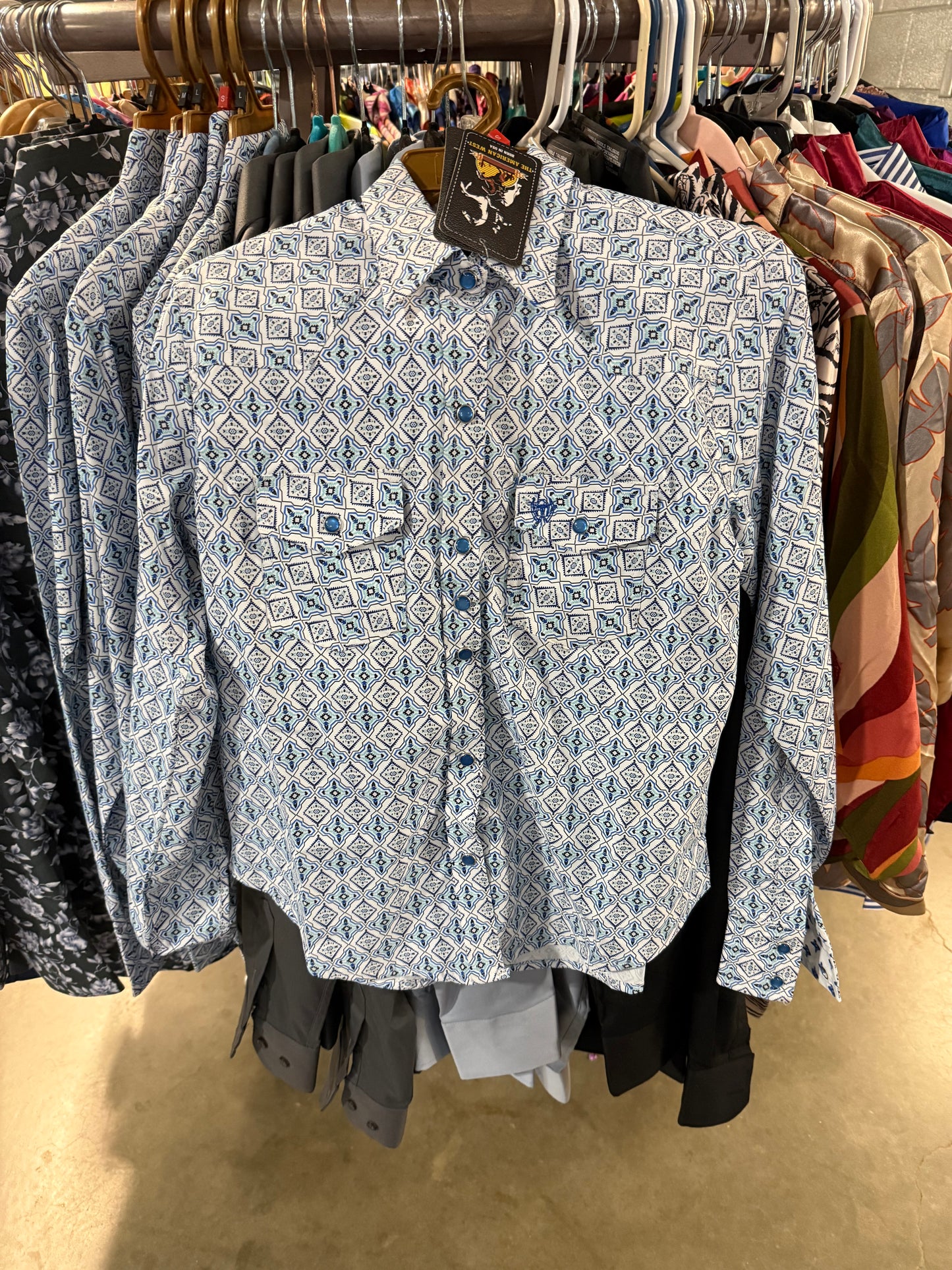 Experience the timeless beauty of the American West with our Blue Patterned Pearl Snap Top. Made with the highest quality materials, this top features stunning patterns and functional pearl snap closures. Add a touch of Western charm to your wardrobe while staying comfortable and stylish!